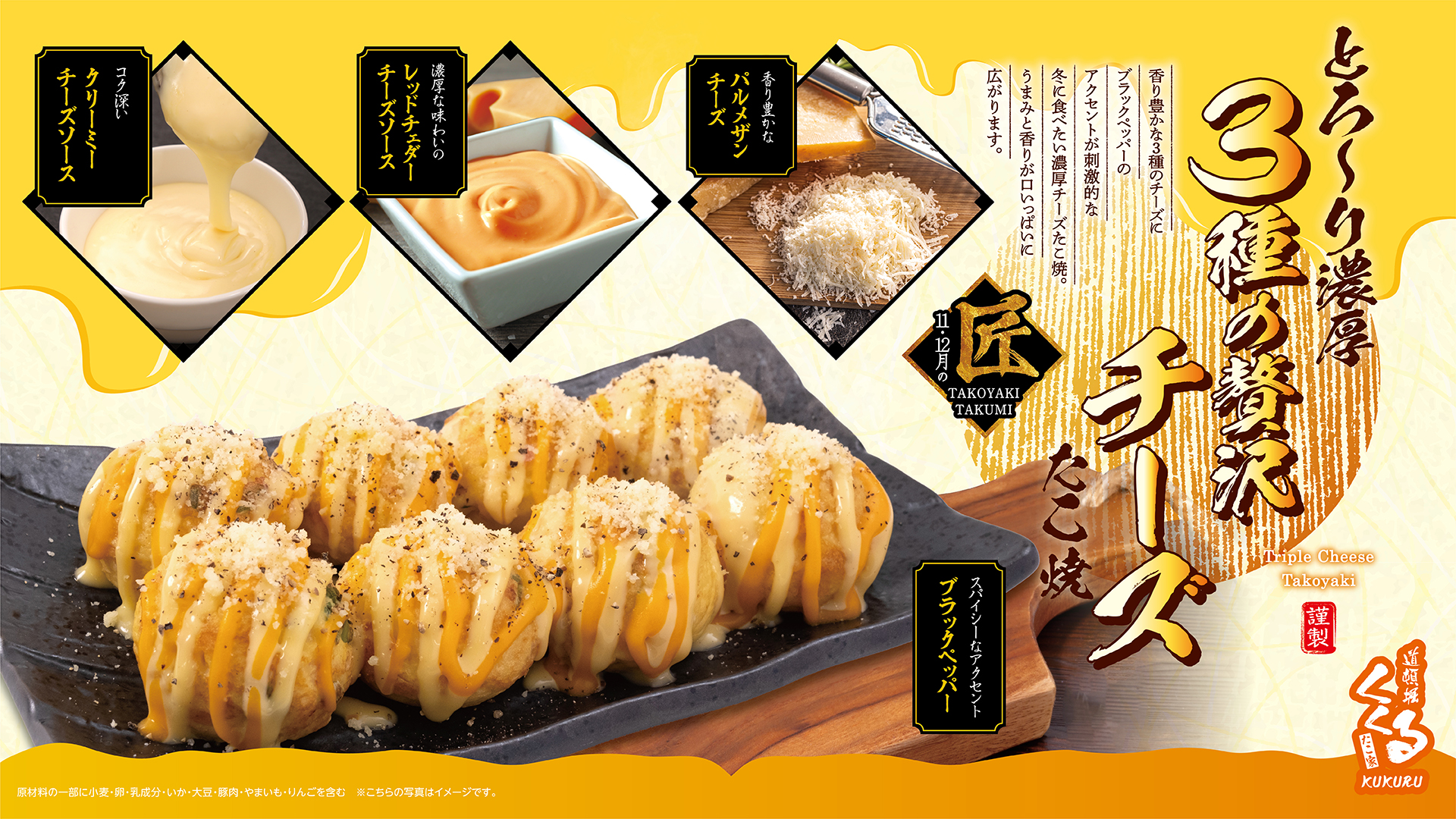 11月1日~限定たこ焼「とろ~り濃厚 3種の贅沢チーズたこ焼」を販売!