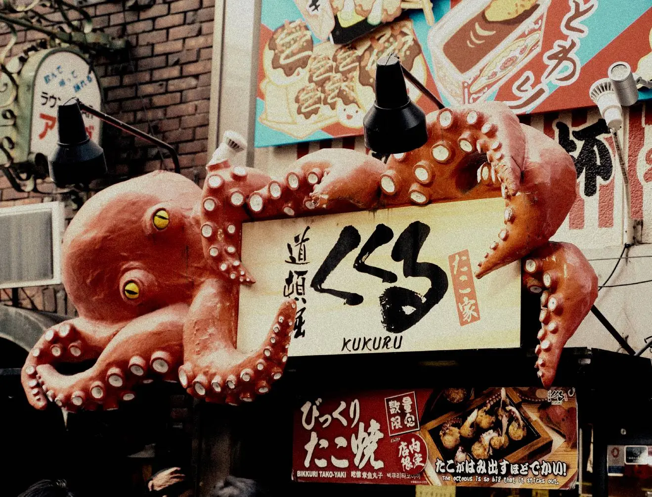 道頓堀側(戎橋)のオスの大たこ。グリコ看板の眼下に負けじと佇む。