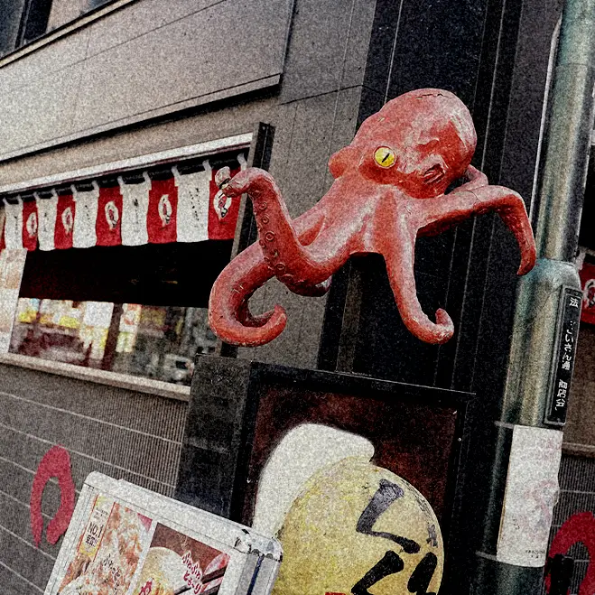 本店正面、メスの大たこ。長きにわたり店の看板として活躍。